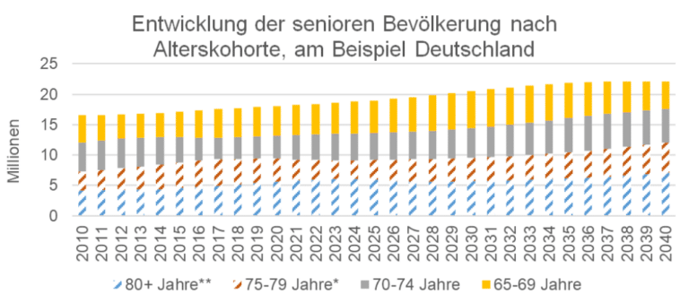 Rund 70 % der Bevölkerung ab 65 Jahren sind 65–79 Jahre alt, nur etwa 30 % über 80. Damit ist die Zielgruppe im Betreuten Wohnen deutlich größer als in Pflegeheimen. Hinzu kommt, dass ältere Menschen ambulante Wohnformen traditionellen Pflegeheimen ausdrücklich vorziehen und teilweise sogar als Alternative sehen. Studien zeigen, dass vor allem Menschen ab 75 Jahren einen hohen Bedarf an betreuten Wohnformen haben. Diese Altersgruppe wächst in Deutschland und der Eurozone in den nächsten zehn Jahren stark und bietet damit ein verlässlich prognostizierbares Nachfragepotenzial.